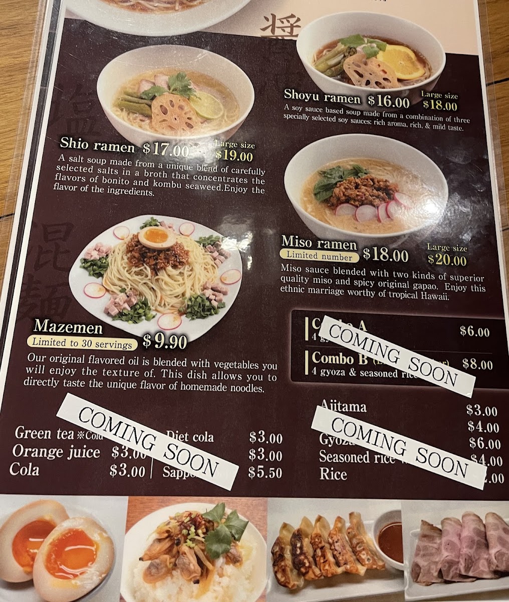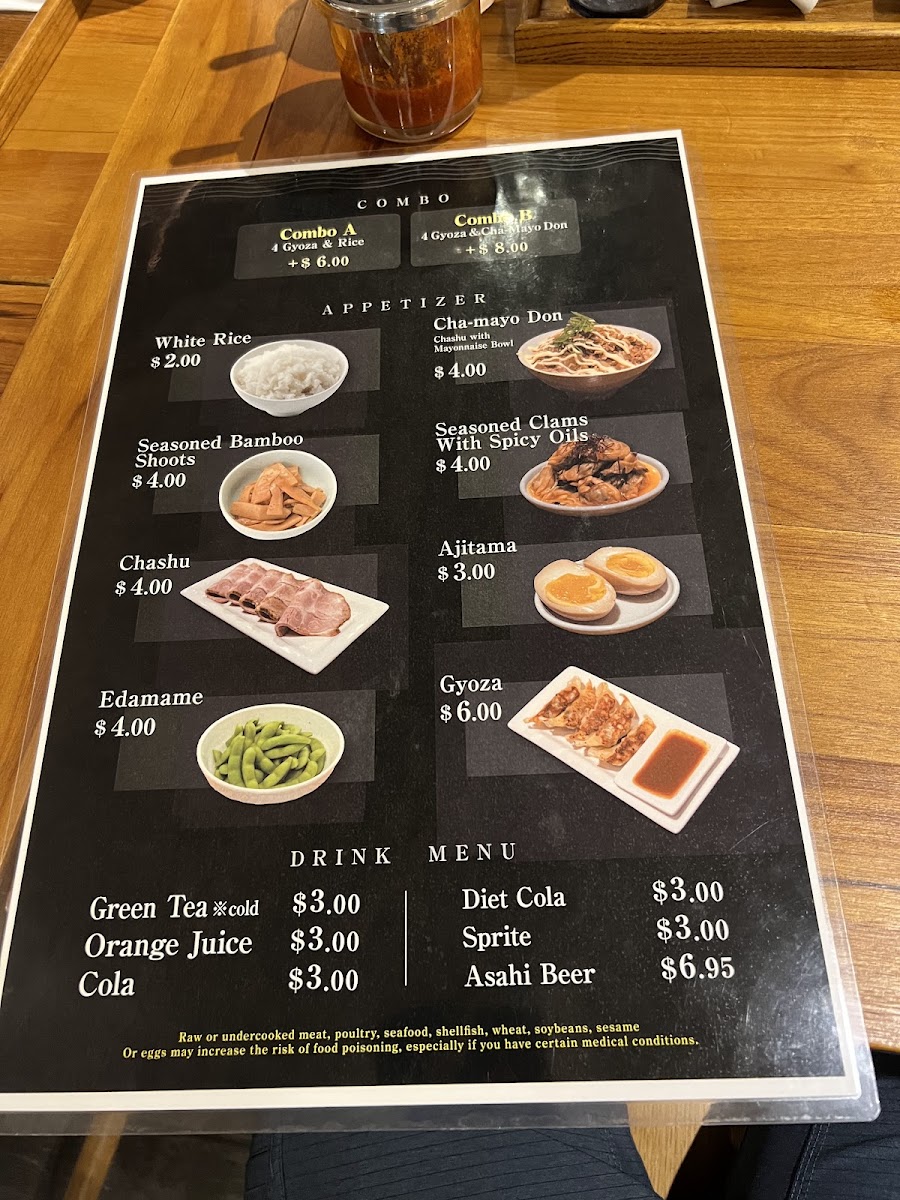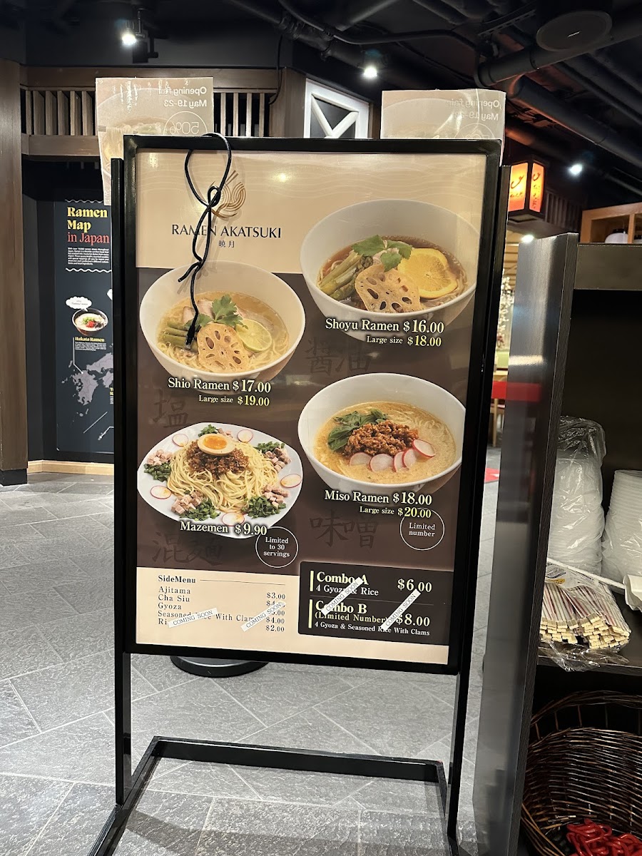 Sampling the menu at Ramen Akatsuki offers a concise yet satisfying glimpse into traditional Japanese flavors with a local twist. The ramen selection caters to both light and hearty appetites, with Shoyu Ramen (R) and Shoyu Ramen (L) delivering a savory soy-based broth, while Shio Ramen (R) and Shio Ramen (L) provide a subtler, salt-forward option. For those seeking a richer profile, Miso Ramen (R) stands out as a comforting choice. The combos, Combo A and Combo B, are well-balanced, pairing ramen with side dishes for a complete meal experience. Speaking of sides, Ajitama, Chashu, and Gyoza offer classic accompaniments, and options like Seasoned rice with clams and plain Rice round out the savory offerings. To complement the dishes, the beverage list includes refreshing choices such as Green Tea (ICE), Orange Juice, Coke, Diet Coke, and Sprite. Overall, the menu strikes a careful balance between familiar staples and thoughtful variety, making it approachable for first-timers while still satisfying for seasoned ramen enthusiasts.