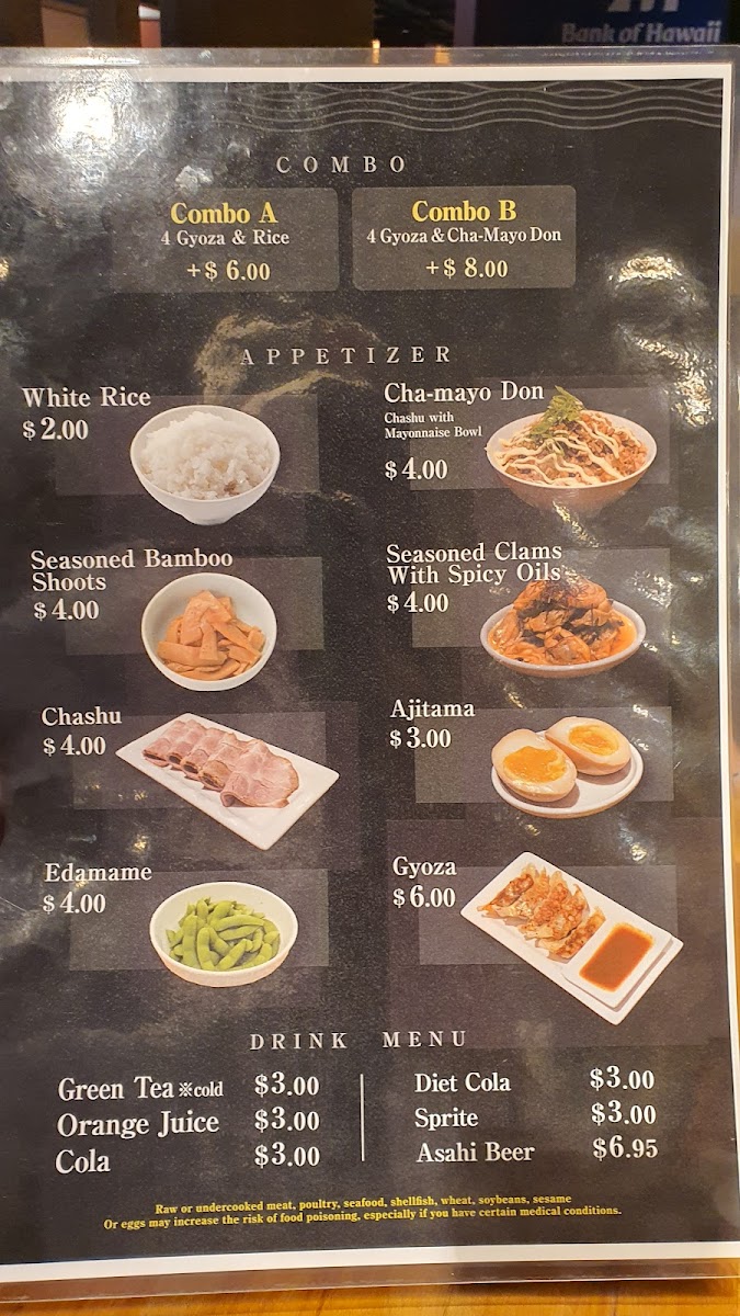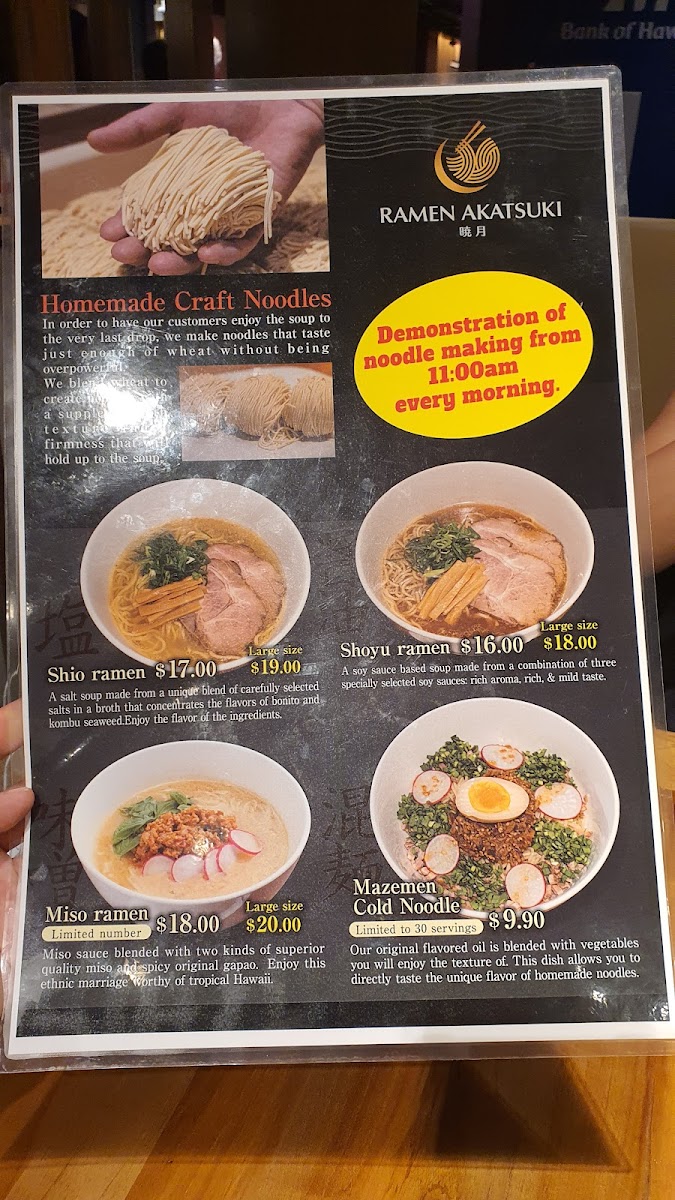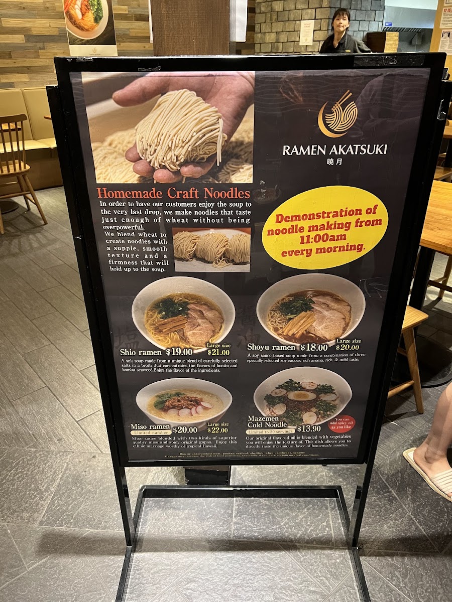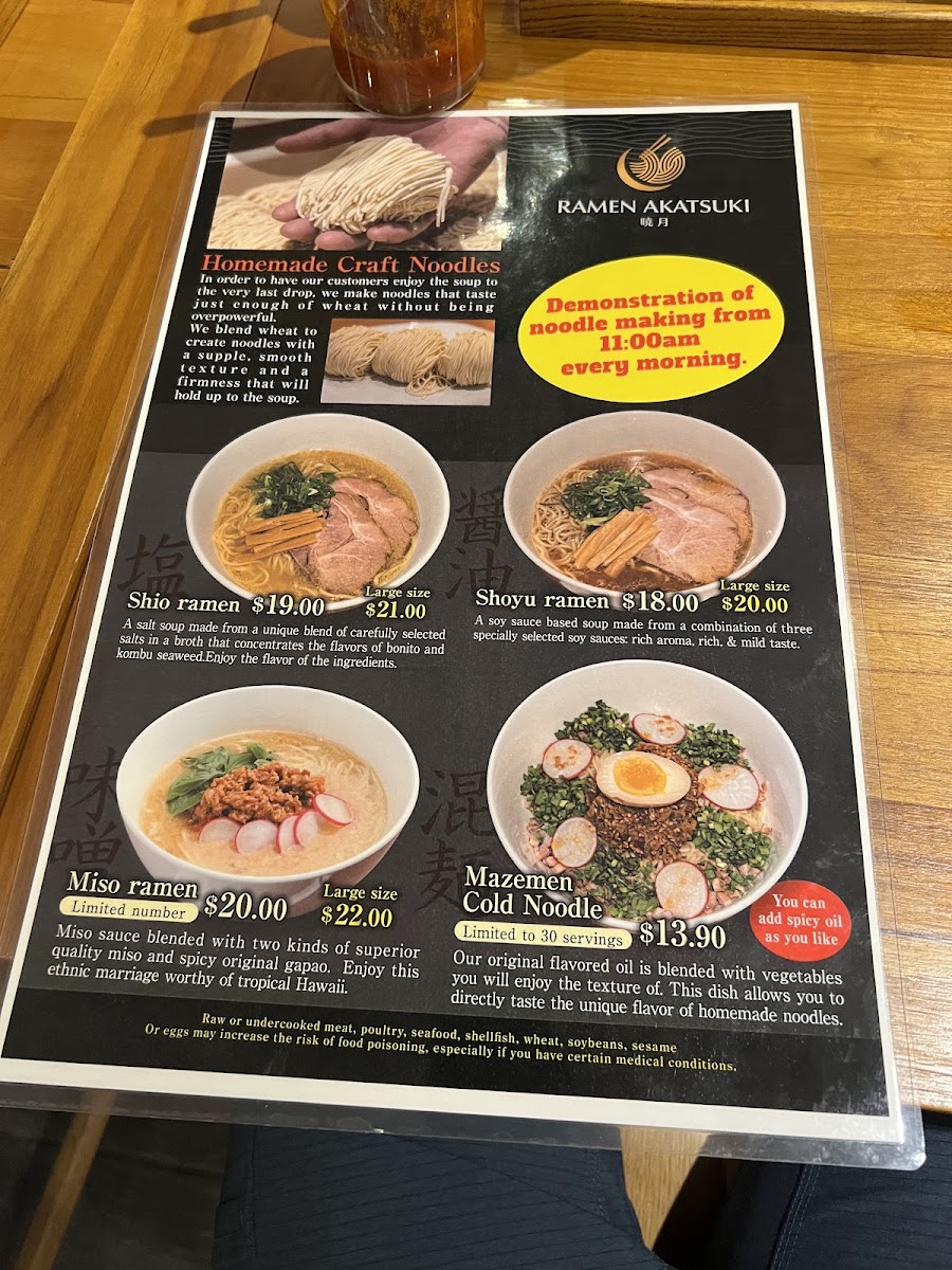 Sampling the menu at Ramen Akatsuki offers a concise yet satisfying glimpse into traditional Japanese flavors with a local twist. The ramen selection caters to both light and hearty appetites, with Shoyu Ramen (R) and Shoyu Ramen (L) delivering a savory soy-based broth, while Shio Ramen (R) and Shio Ramen (L) provide a subtler, salt-forward option. For those seeking a richer profile, Miso Ramen (R) stands out as a comforting choice. The combos, Combo A and Combo B, are well-balanced, pairing ramen with side dishes for a complete meal experience. Speaking of sides, Ajitama, Chashu, and Gyoza offer classic accompaniments, and options like Seasoned rice with clams and plain Rice round out the savory offerings. To complement the dishes, the beverage list includes refreshing choices such as Green Tea (ICE), Orange Juice, Coke, Diet Coke, and Sprite. Overall, the menu strikes a careful balance between familiar staples and thoughtful variety, making it approachable for first-timers while still satisfying for seasoned ramen enthusiasts.